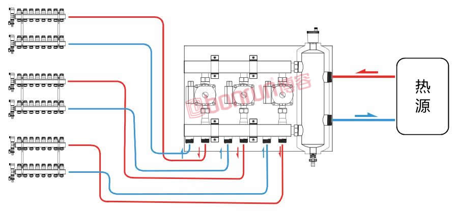 3、均衡各區(qū)域室溫(去耦集成系統(tǒng)讓水泵實(shí)現(xiàn)獨(dú)立環(huán)路,互不干擾)