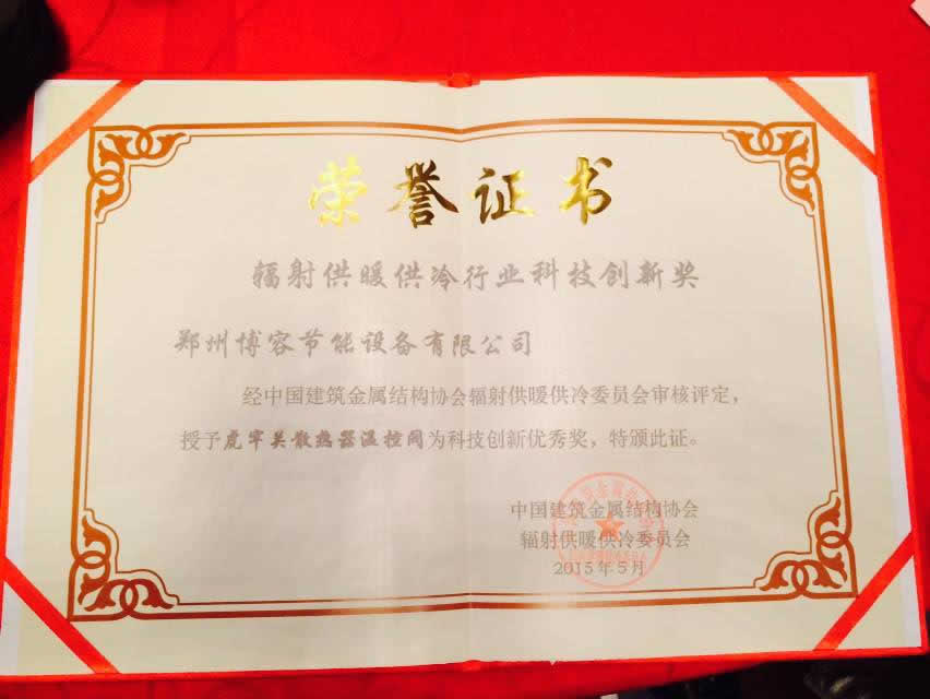 2015年5月15日,在中國(guó)地暖委員會(huì)十周年慶典科技創(chuàng)新大賽中,鄭州博容公司的變形金剛混水系統(tǒng)和虎牢關(guān)溫控閥分別獲得“金星獎(jiǎng)”和“優(yōu)秀獎(jiǎng)”,這兩個(gè)獎(jiǎng)項(xiàng)是地暖界最權(quán)威、最高級(jí)別的獎(jiǎng)項(xiàng),堪稱地暖界的“奧斯卡獎(jiǎng)”。 博容公司成為科技創(chuàng)新大賽最大贏家。